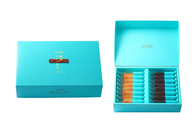 Chocolate lovers shouldn't miss the Tokyo Campanella cookies. The elegant Tiffany-blue box contains three-layered langue de chat cookies filled with chocolate cream. The mixed gift box with chocolate and white chocolate is perfect for sharing with friends for a delightful post-meal treat.
