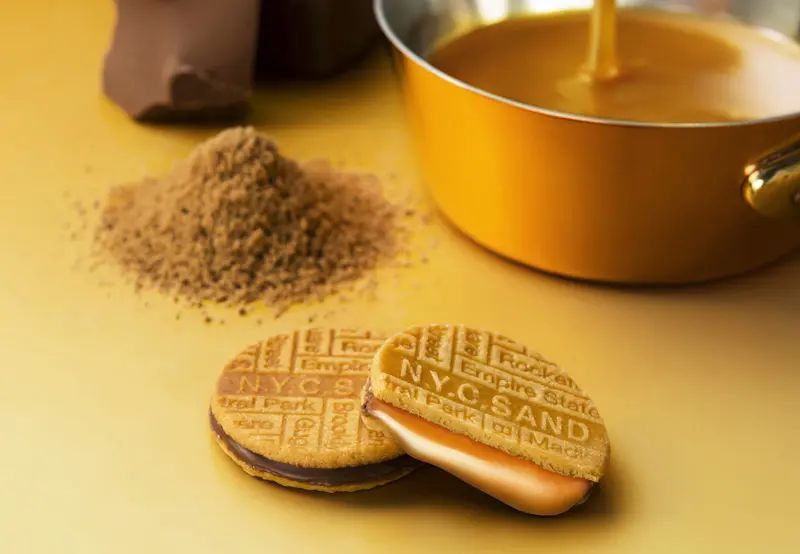 N.Y.C. Sand has perfected its caramel cookies over a decadeātheir most popular product is their namesake cookie, where a smooth layer of caramel is enclosed in a thin layer of chocolate and sandwiched by two crispy cookies.