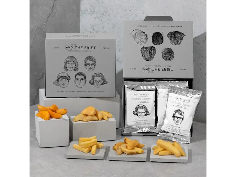 And The Friet, a specialty fries shop in Tokyoās Hiroo neighborhood, offers potato chips in a mini gift box with five flavors: classic salt, cheddar cheese, double black truffle salt, honey butter, and garlic anchovy. The chips are cut to the perfect size for a crispy texture, while the packaging features artistic hand-drawn portraits.