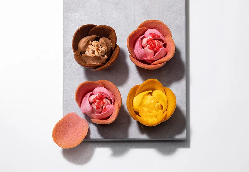 Resembling tulips in bloom, Tokyo Tulip Rose features cat tongue cookies shaped like flowers, filled with creamy chocolate, and topped with dried nuts. Each box includes three flavors: berry, passion fruit mango, and caramel coffee chocolate. These cookies are crisp and richly flavored, making them irresistible and a hot topic since their launch.
