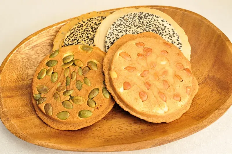 Senbei, a traditional Japanese snack made from rice flour, wheat flour, and other ingredients, is kneaded, rolled thin, and then baked on an iron plate or net. Itâs also a popular choice as an appetizer.